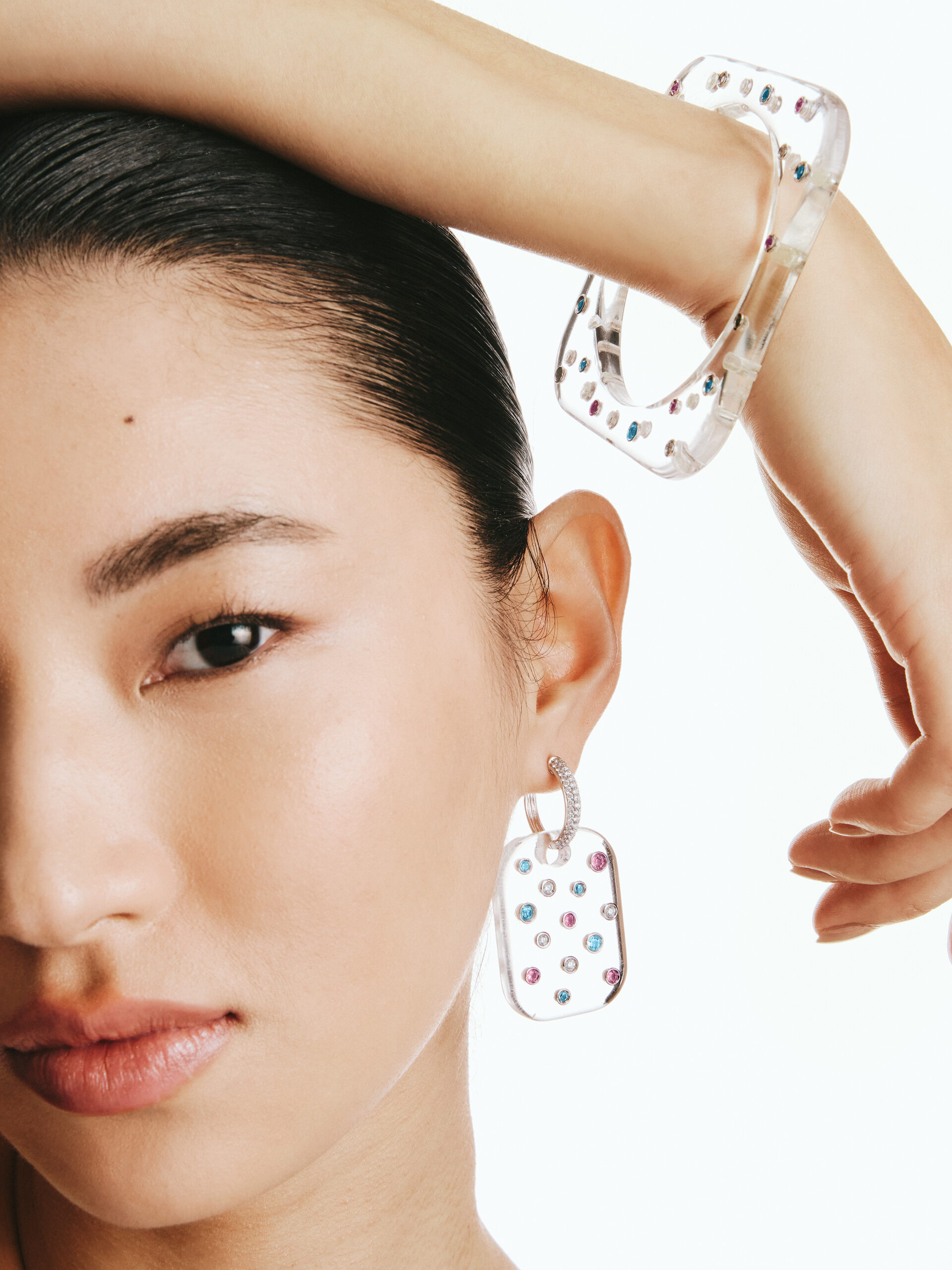 “ICE” EARRING – acrylic plate and 18k white gold hoop set with pavé white diamonds, pink sapphires, and Swiss blue topaz.