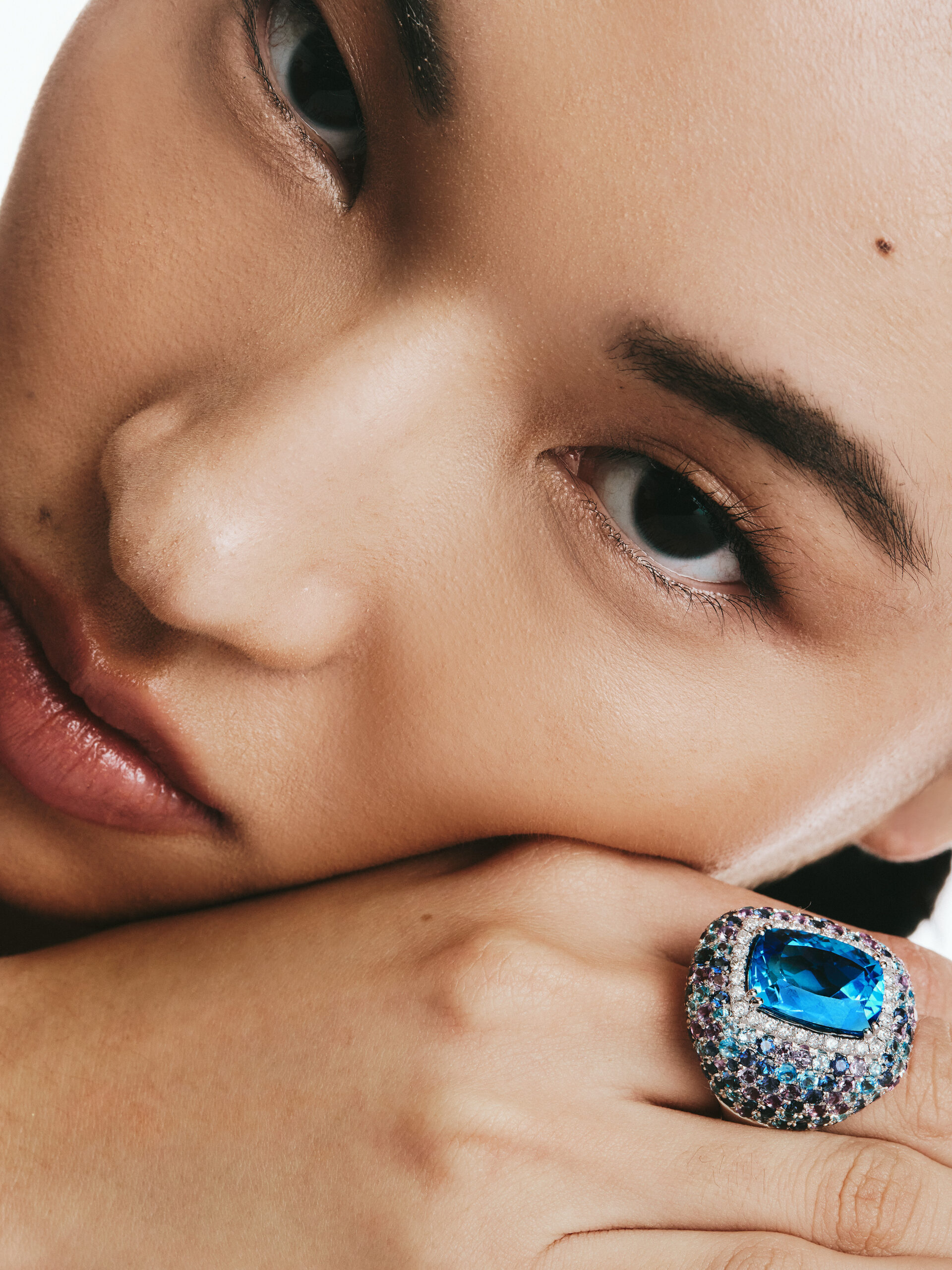 In the “Ice” earrings, acrylic transforms into space, a transparent field where the gemstones seem to float between light and silence. The pavé-set plate of diamonds, amethysts, and emeralds can be removed, replaced, repositioned. Three possibilities, one single desire: to transform the instant.
