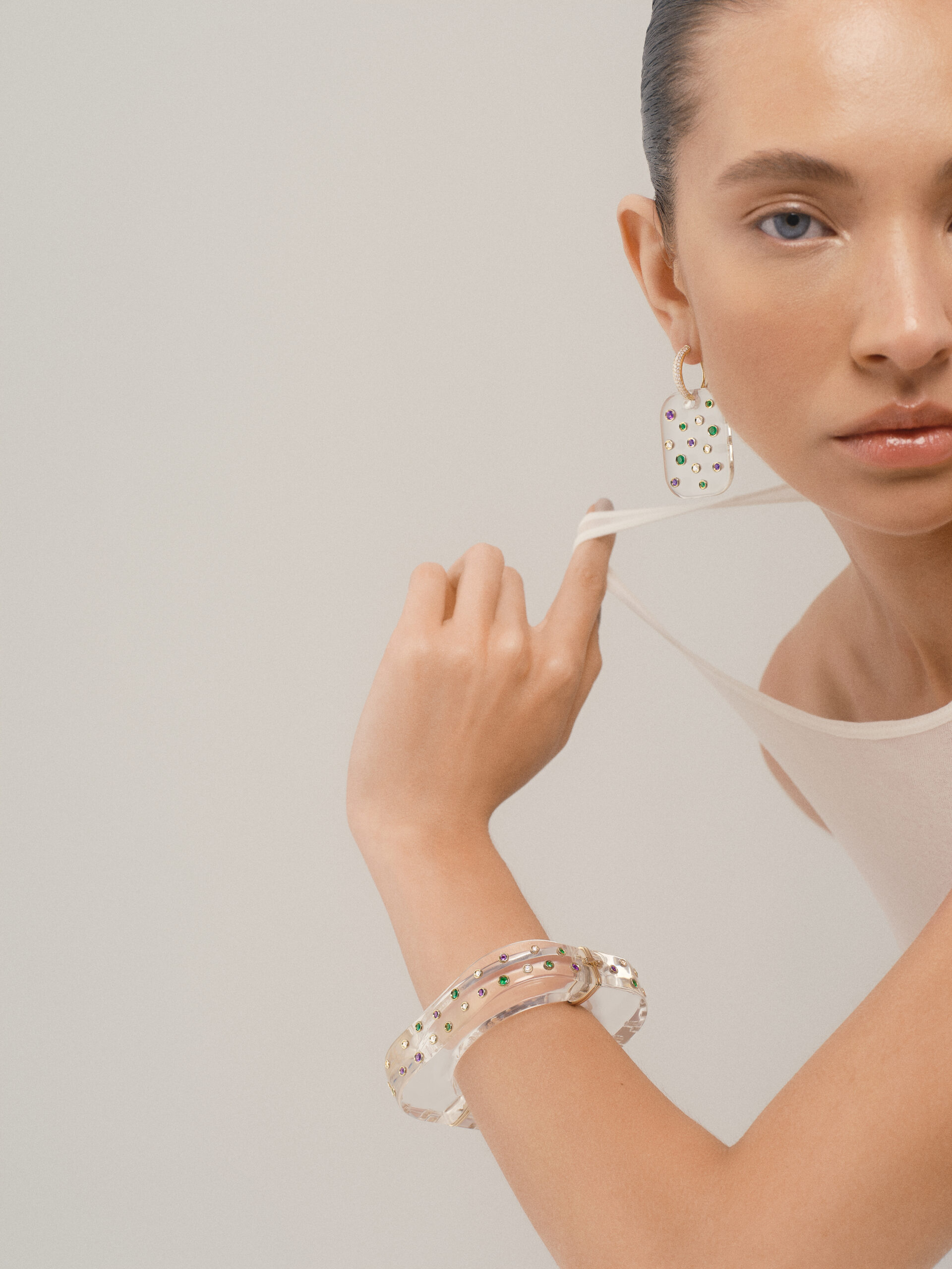 “ICE” EARRINGS – acrylic plate and 18k yellow gold hoops with pavé white diamonds, amethysts, and emeralds. Convertible design: 3 in 1.
