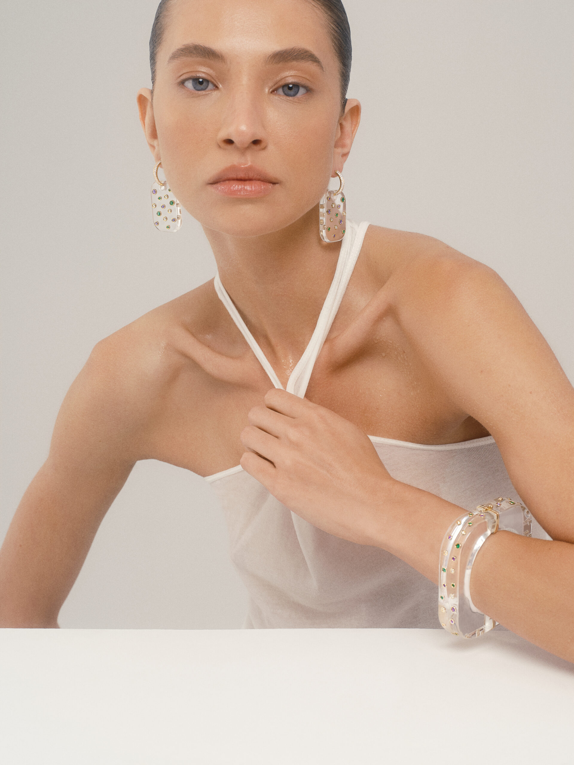 “ICE” EARRINGS – acrylic plate and 18k yellow gold hoops with pavé white diamonds, amethysts, and emeralds. Convertible design: 3 in 1.