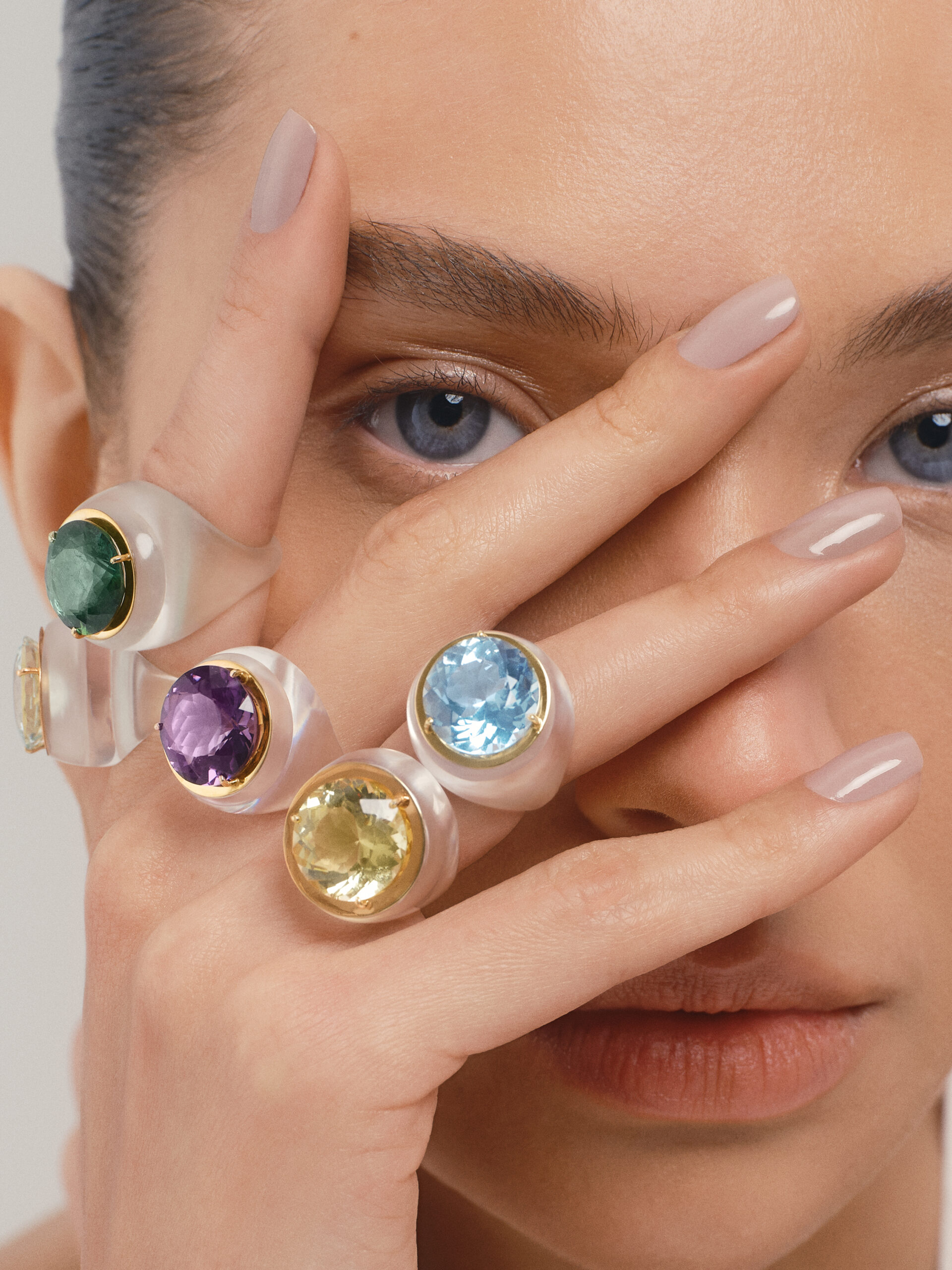 “ICE” RINGS – acrylic, 18k white or yellow gold with sky blue topaz, amethyst, citrine, aquamarine, and green tourmaline.